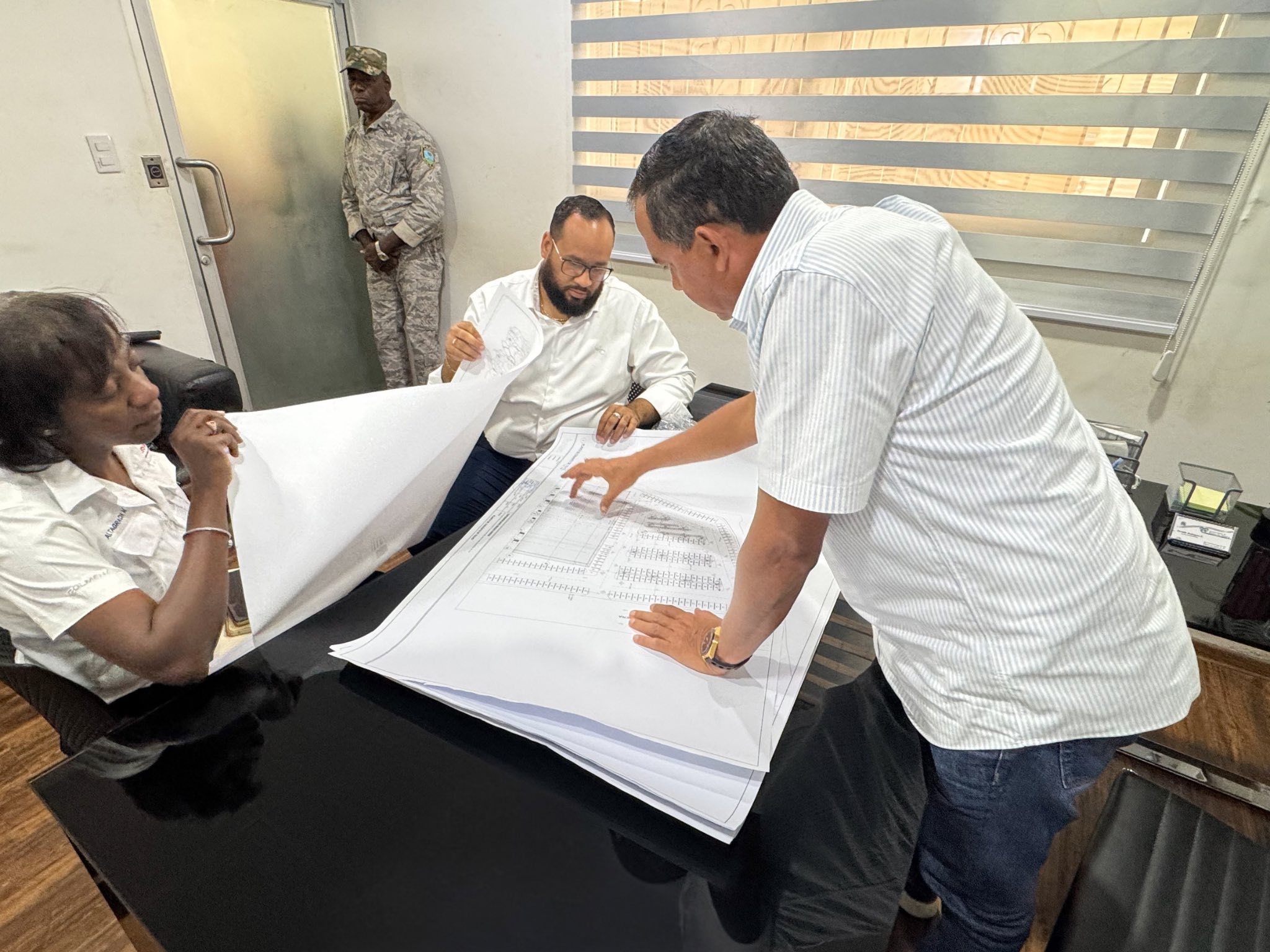 El alcalde de Haina Osvaldo Rodríguez y el arquitcto Eric Fernández, analizan los planos para la construcción de la estructura donde funcionará el Supermercado Bravo en la avenida José Francisco Peña Gómez. Gestión 2024-2028.